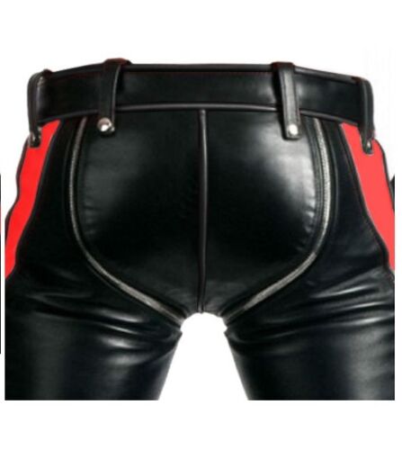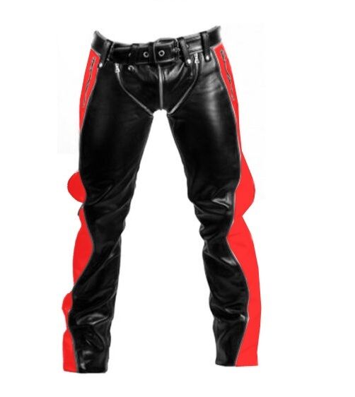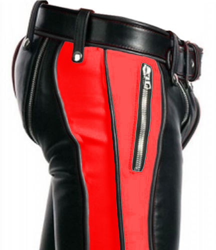 Men Black Leather with Red Piping Pants Heavy Duty Bondage Jeans - R2-RP - Men Black Leather with Red Piping Pants Heavy Duty Bondage Jeans - R2-RP -